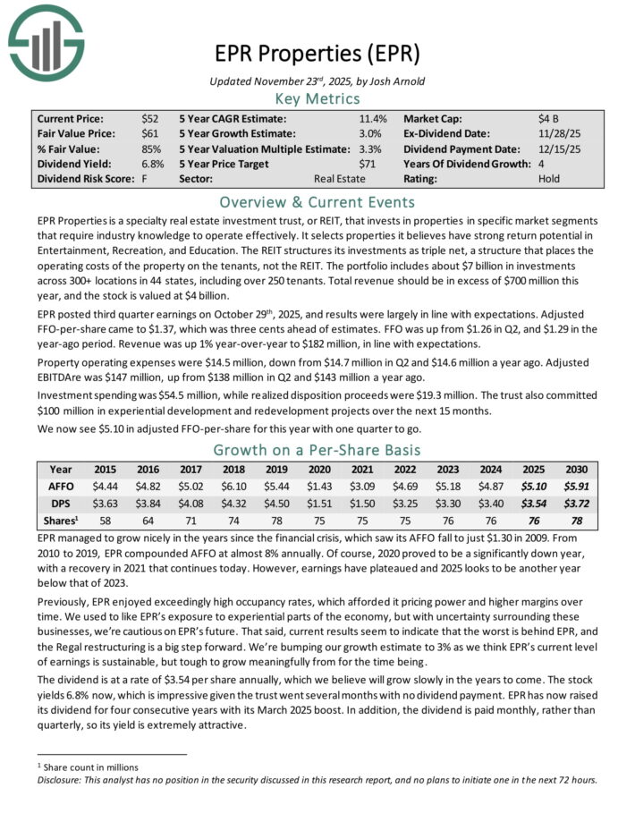 EPR Properties is a specialty actual property funding belief, or REIT, that invests in properties in particular market segments that require trade information to function successfully.