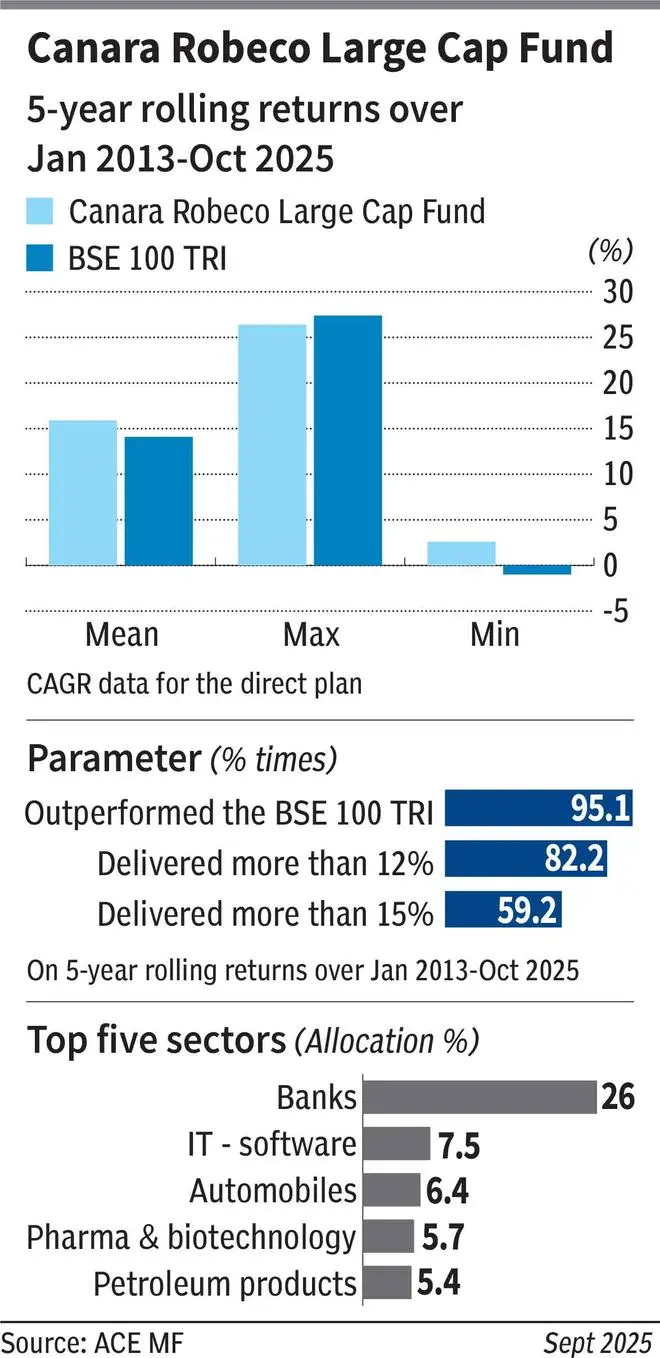 When it comes to consistency, the fund stands out. On five-year rolling returns from January 2013 to October 2025, the fund has overwhelmed the BSE 100 TRI over 95 per cent of the time, putting it among the many greatest within the class. The imply return over this era was a sturdy 15.9 per cent, whereas for the BSE 100 TRI, it’s 14.1 per cent.