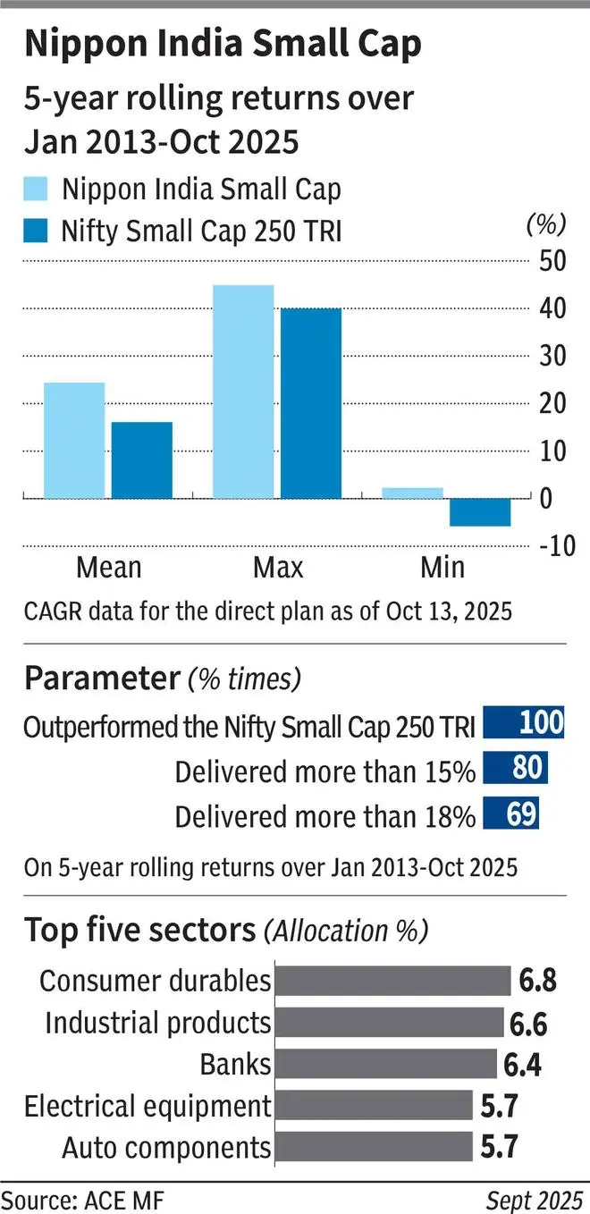 Return consistency has been spectacular. On a five-year rolling returns foundation from January 2013 to October 2025, the fund has outperformed its benchmark on a regular basis (100 per cent). Nippon India Small Cap’s imply returns over the above rolling interval and time horizon is a staggering 24.4 per cent, greater than 8 share factors increased than the Nifty Small Cap 250 TRI’s 16 per cent.