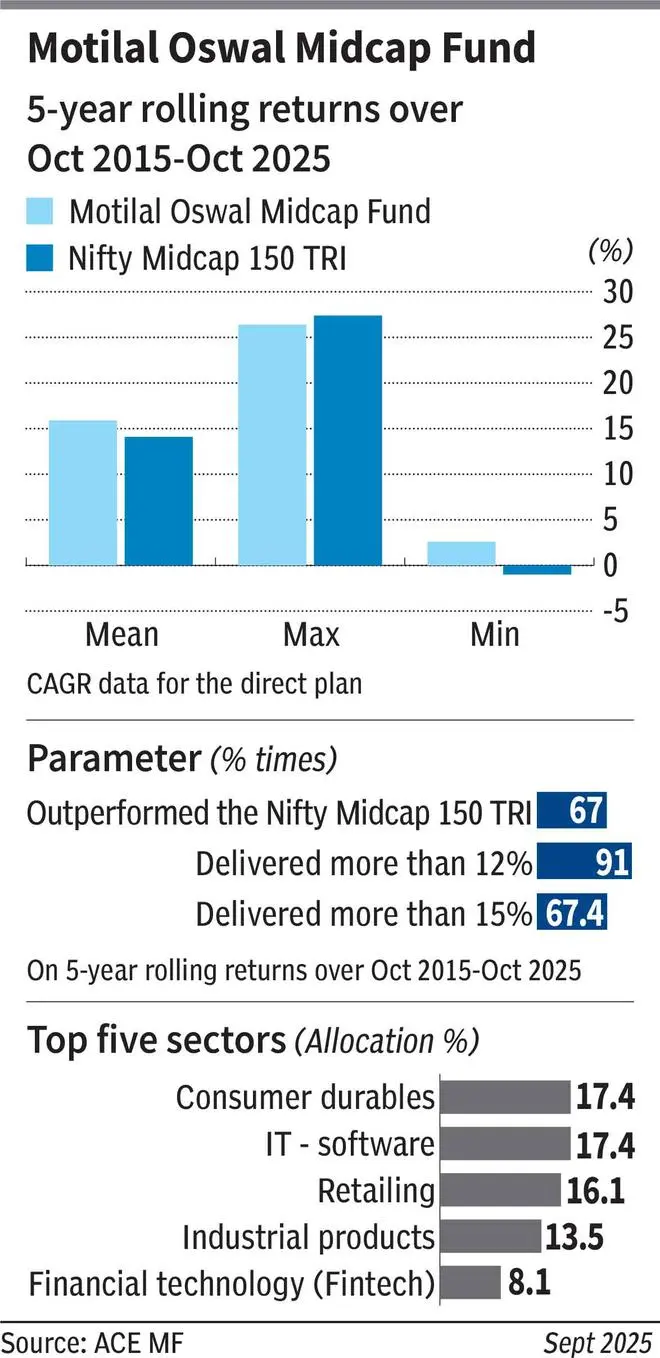 Motilal Oswal Midcap Fund gave greater than 15 per cent for over 67.6 per cent of the 10-year interval (October 2015 to October 2025) on a five-year rolling foundation and gave greater than 18 per cent returns practically half the time.