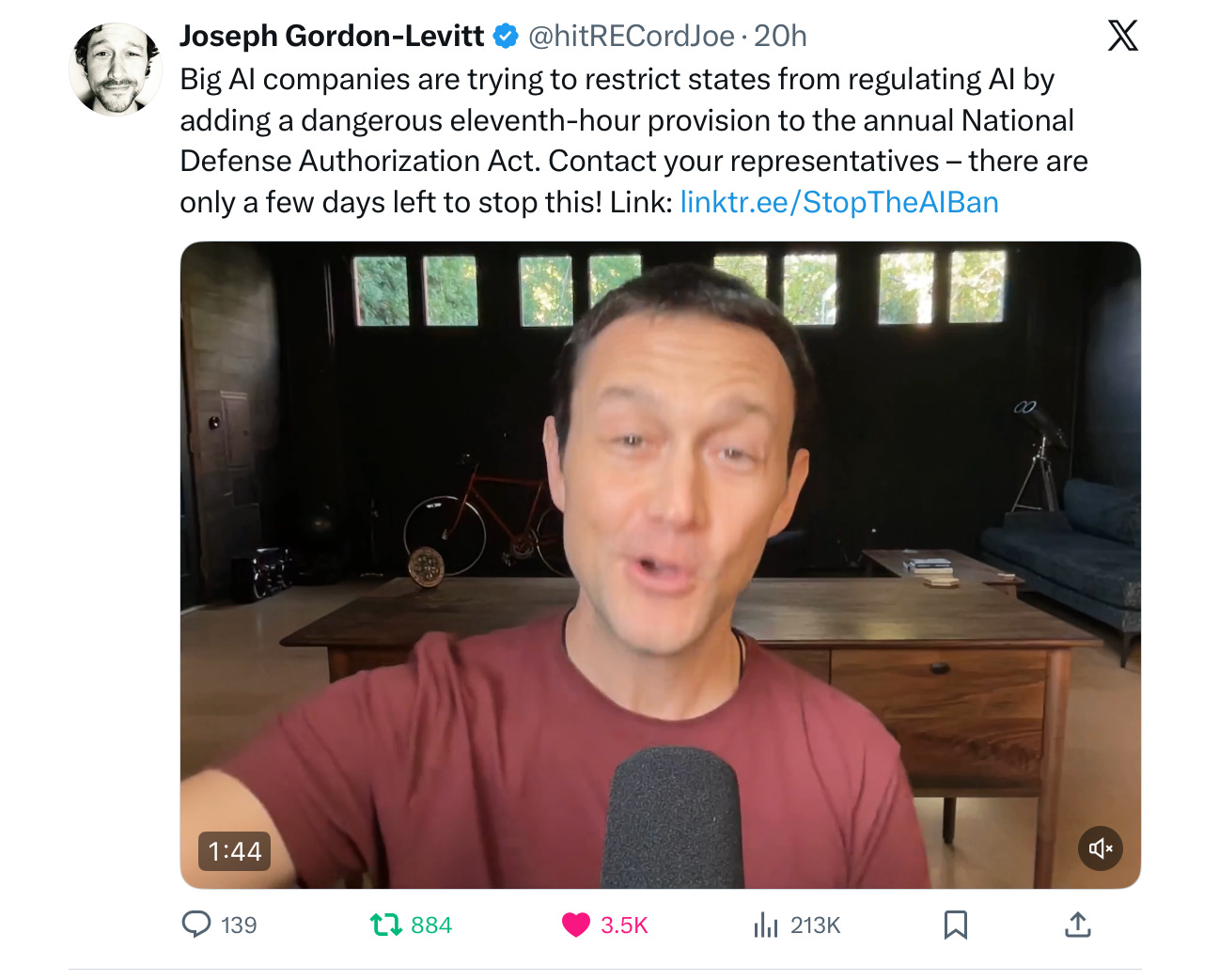 Name your Congress folks, ASAP; don’t let the White Home lower them and the states you reside in on the knees. I urge you within the strongest potential phrases to comply with the hyperlinks that Joe Gordon-Levitt equipped at https://linktr.ee/StopTheAIBan, in order that states can shield their residents from the numerous risks of AI, short-term and lengthy. Airways have laws, automobiles have laws, bakeries have laws; AI bots that inform children to kill themselves don’t.