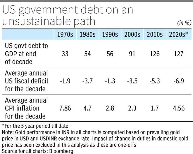 This is without doubt one of the major causes that has pushed the outperformance of gold within the present decade. Add to this, US authorities fiscal deficit at 6-7 per cent, when debt to GDP is at 127 per cent, implies authorities spending is on an unsustainable path.