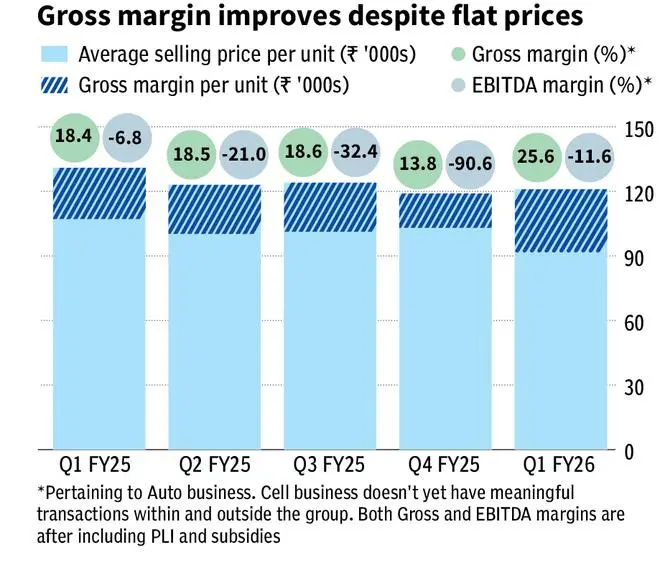 Ola has two companies/verticals – one which manufactures and sells e-2Ws (Auto enterprise), and the opposite that manufactures cells for battery packs (Cell enterprise). Q1 FY26 noticed substantial enchancment in gross margin from 18 per cent in FY25. Within the month of June, the Auto enterprise even turned EBITDA-positive, per the administration. As might be seen from the chart, worth or realisation hasn’t performed a significant function in margins bettering. What in actual fact has, is the BoM (invoice of supplies) value discount, because of greater share of in-house components.