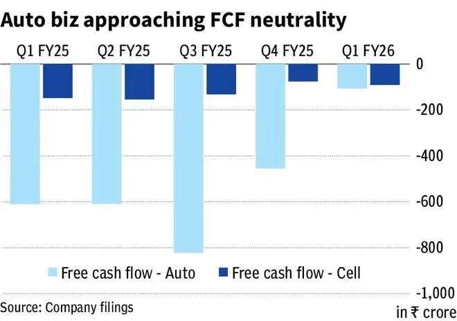 Ola’s cell Gigafactory is budgeted to value about ₹2,800 crore. That is to construct a capability of 5 GWh, which roughly means about 12 lakh autos might be outfitted with a battery pack of 4 kWh. For context, about 11.5 lakh e-2Ws have been offered within the nation in FY25. The plant already has a capability of 1.4 GWh and Ola has spent about ₹1,500 crore on it. The capex projection for FY26, for constructing the remainder of the capability, is about ₹1,000 crore; the stability could be made within the subsequent 12 months. Therefore, the Cell enterprise received’t change into FCF impartial within the close to time period.